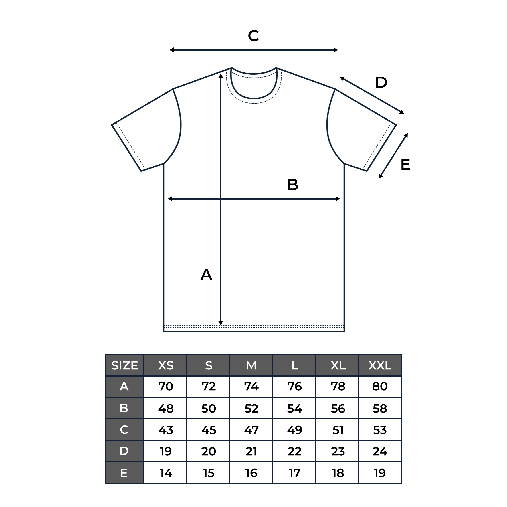 XS, S, M, L, XL, XXL